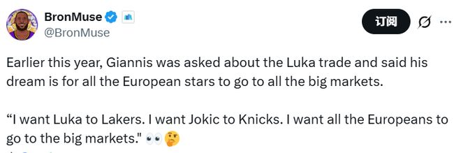另外,字母哥在东契奇被交易到湖人时的言论被扒出,当时他说道:“我希望东契奇能去湖人,希望约基奇能去尼克斯,我希望所有欧洲球员都能加盟大球市球队。”如今回顾这段言论,这或许也暗示着自己想去大市场球队。